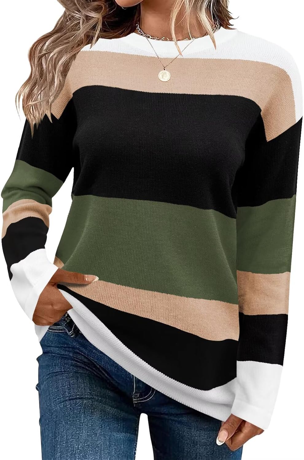• This cute striped sweater is made of a high-quality wool blend fabric, soft to the touch and extremely warm, perfect for autumn and winter. The crew neck and long sleeves, combined with the lively striped pattern, give you boundless energy and youthful vibes. The loose fit ensures comfort and easily pairs with various bottoms, becoming a highlight of your everyday look.
